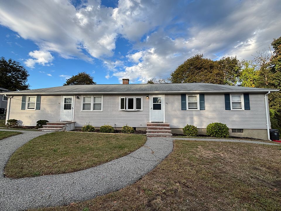 SPECIAL 2 WEEKS FREE!!. Move in October 15 First month rent is November 1. Three bedroom one bath duplex unit available. Renter pays all utilities and the water. This unit has a large cathedral ceiling kitchen addition and a shared stairwell to the basement. There is a side yard and a driveway for two cars. The kitchen has a cathedral ceiling And an opening to the living room with a bar newly tiled bathroom the living room and three bedrooms have carpeting. Washer dryer hook ups are in the basement. Very convenient to route 128. Great school system and nice neighborhood.