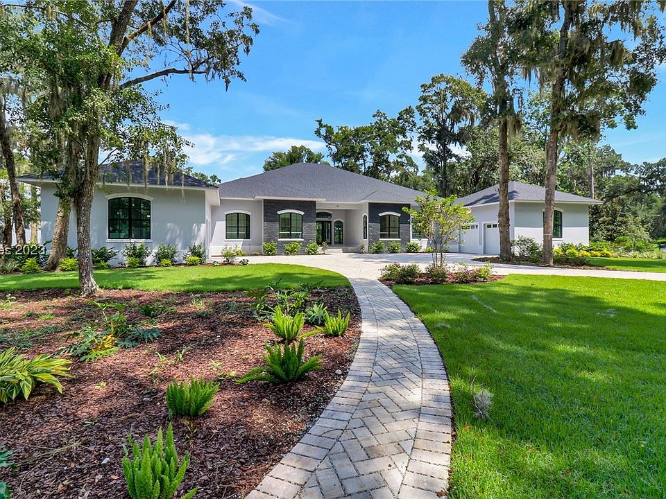 Introducing a move-in ready, custom-built home available to close now! Situated on almost an acre of land, this 4300 sqft property boasts 4 garages and a 86ft paved motor court. The energy-efficient, one-story home meets 180 mile wind load standards and features custom black windows. Inside, enjoy wood floors, a stunning stone bio fuel fireplace, custom kitchen with a 48" refrigerator and 11ft island. Be impressed with the stunning kitchen upgrades along with 12 ft ceilings and trey ceilings in most rooms. Outside, a 1500 sqft outdoor entertaining area with an outdoor kitchen offers unobstructed lake views. Don't miss this beautiful home!