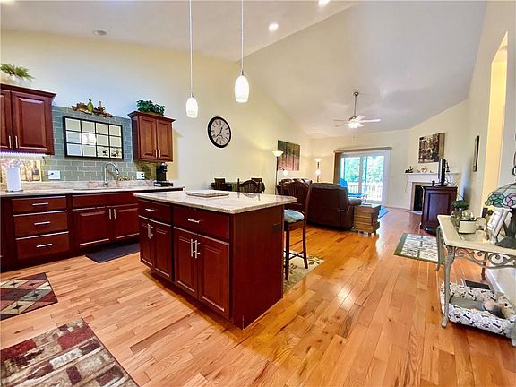 Great opportunity for one-level living in Rock Cliff Farms in North Smithfield. Farmer's porch entrance with attached garage and driveway parking. Open-living concept with cathedral ceilings and hardwood floors. Kitchen with stainless steel appliances, granite countertops, granite kitchen island with seating, and solar tube skylight. Living room with gas fireplace and slider to deck. Primary bedroom with tray ceiling and en suite bathroom with granite vanity and walk-in closet. Additional full bathroom with granite vanity and laundry facilities. Gigantic unfinished basement with approximately 1200 sq. feet. New gas hotwater tank, Gas warm air heat with central air conditioning. Additional guest parking available close to unit. Near shopping, dining, recreation, and Route 146