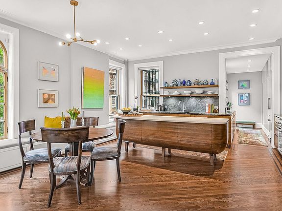 Step inside to discover the splendid features of this four-story, five-bedroom, three-bathroom residence. All aspects of the home have been updated. Each corner of this home speaks of meticulous attention to detail and high-end craftsmanship. The heart of the parlor floor is a custom designer kitchen with high-end appliances, soapstone countertops/backsplash, and a striking, curved kitchen island topped with Calacatta Ora marble. The kitchen is functional and aesthetically inspiring, with elegant finishes and ample concealed storage. It is a space crafted for culinary creativity and family gatherings.