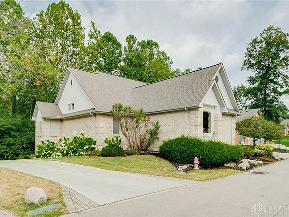 A rare find in Greenleaf Village, this brick ranch patio home offers a seamless blend of indoor-outdoor living, with decks on both levels overlooking a private wooded creek. Tucked away on a quiet cul-de-sac, right at the entrance to the Sycamore Creek Country Club, this location offers the perfect blend of privacy and convenience. Step inside a world of light and elegance where soaring ceilings and a dramatic vaulted great room set the stage for sophisticated living, with large floor to ceiling windows, transom windows and skylights providing abundant natural light. A spacious open concept design sets the stage for entertaining with an elegant formal dining room separated from the great room with classic columns and featuring a stylish tray ceiling. The main level offers everything needed for long-term accessibility. The primary bedroom suite features a light-filled en-suite bathroom with a double-sink vanity, jetted tub, and large walk-in closet with a custom organization system. The gourmet kitchen features a gas stove, granite and solid-surface counters with tile backsplash, Italian marble ceramic flooring, and a built-in wine rack. An extra-large laundry room is located between the kitchen and the two-car garage, featuring a deep pantry, coat closet and storage cabinets. Two additional bedrooms (one currently used as an office) and a full bathroom complete the main floor. The fourth bedroom is in the basement and also includes a large walk-in closet with built-in organization system, and an adjacent full bathroom. The finished walk-out basement features a large great room with gas fireplace and an unfinished storage area. Conveniently located 23 min to WPAFB Area B, and 14 min to I-675, less than 10 min to shopping and restaurants at Austin Landing.