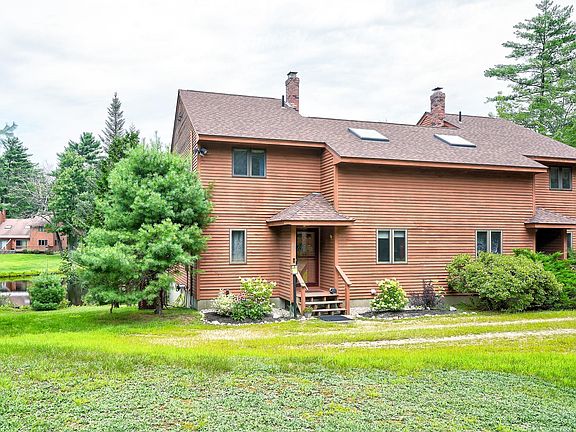 This spacious, 3 bedroom, 3 bath Brook View Village townhome, conveniently located off of North Conway's West Side Road, is one of Mt Washington Valley's best kept secrets. After entering through the large mudroom, you will find the bright, open concept main level with cathedral ceiling living room, cozy wood stove with brick hearth and backing, and sliders leading to the huge south facing deck which overlooks the association pond. There is also a full bath and bedroom on this level. The 2nd level features a loft living area, primary bedroom suite, the 3rd bedroom and an additional bath. The unfinished walkout lower level, with sliders leading you out to the pond, and additional windows bringing in plenty of natural light, offers an opportunity to add additional living space. This townhome not only offers the most private location within the association, but also the ability for you to hike to Diana's Baths or the Moat Mountains right from your doorstep. Just 5 minutes to North Conway Village too!