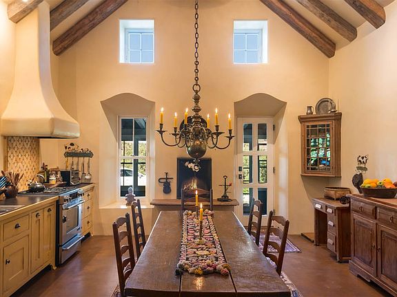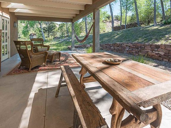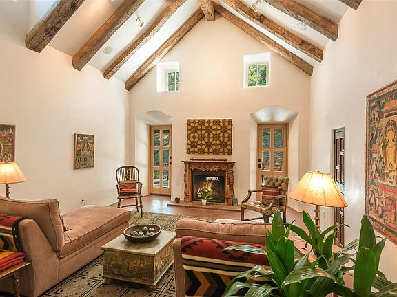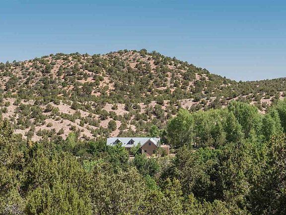 Rural River Paradise The Rio en Medio meanders through this idyllic 15-acre estate, a lush paradise that includes aspens and fruit trees, a pond, and a ditch with soothing sounds of rushing water. The home is a paradigm of quiet, stylish country living, with airy pitched ceilings, thoughtfully used natural materials, plentiful windows, geothermal heating and cooling, and doors opening to sunrooms, portales, and hillsides. Distinctive ceramic countertops, an eye-catching mosaic, and timeless wood cabinetry create an alluring European country ambience in the kitchen. The classical living room has a dramatic ceiling, an elegantly carved fireplace mantel, a discreet Murphy bed, and doors to a cool portal. A restful retreat, the master suite includes a spa-like bath. The other warm, welcoming private spaces are versatile, easily functioning as bedrooms or offices. There are two bedrooms and an office and the large office can easily be converted to a bedroom. This is a rare opportunity to relax in utmost seclusion and enjoy the tranquility and natural beauty for which northern New Mexico is known.