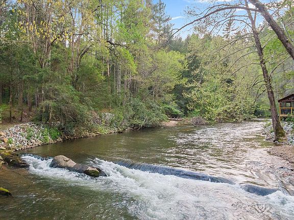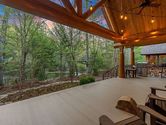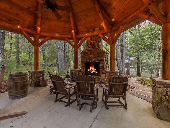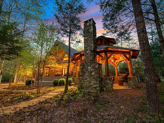 Luxury Canadian Log Craftsmanship in the heart of Aska Adventure Area sitting amongst lush hardwoods and on the banks of the rushing Toccoa River! Overlooking trophy trout streams with an expansive and private riverfront lot w/ intricate landscaping and boulder steps into the water, this custom-built mountain lodge is the quintessential mountain retreat w/ a sprawling back deck, outdoor lodge pole pavilion w/ towering stacked stone F/P, and views up and down the Toccoa! Large oversized heated/cooled two car garage and workshop sits beneath a large linen/laundry room and pantry, and upstairs above the garage is the perfect den space with large game area, observation windows, TV/media room and half bath. Additional special features include outdoor shower, pea gravel driveway, additional loft sleeping area, and a beautiful office/work area off the primary suite. Interested parties -- also inquire on the next door additional RIVERFRONT lot w/ three car garage and studded guest house above at an additional price.