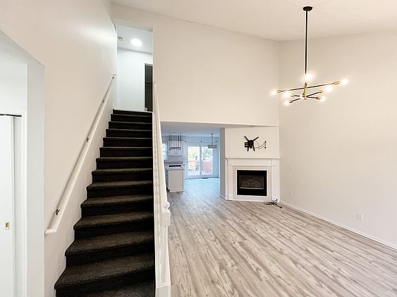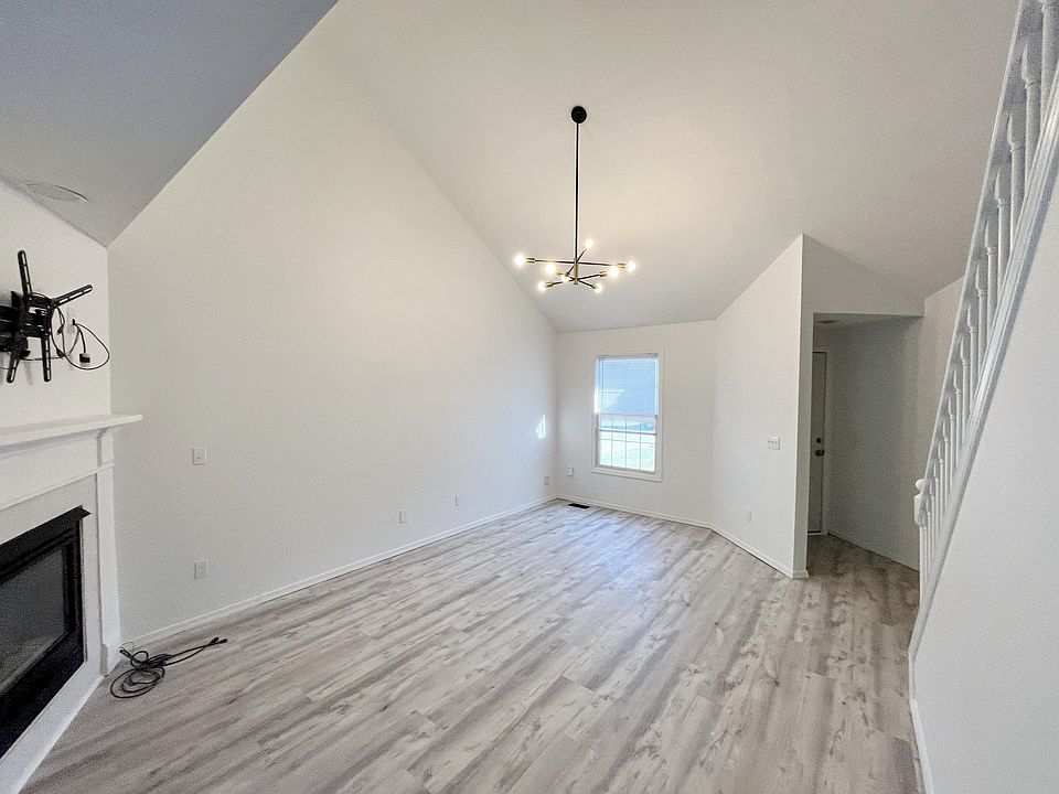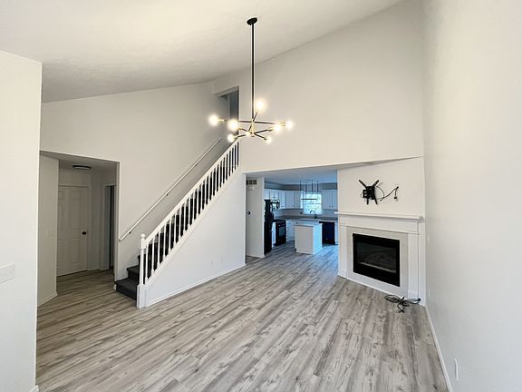 - Open Concept Living Room with soaring ceilings, modern chandelier & cozy gas fireplace
