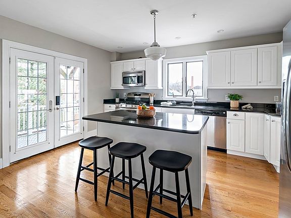 This bright and sunny top-floor duplex condominium is ideally situated between the Charles River, Watertown Sq, and Arsenal Yards. The front living room boasts expansive views through oversized bay windows and includes a built-in cabinet for organization. The timeless white kitchen features stainless steel appliances, black granite counters, and a central island, with French doors leading to a private deck. On the top level, you'll find 3 bedrooms and 2 bathrooms, including a primary suite with cathedral ceiling, a spacious walk-in closet with California closet system, and a luxurious adjoining bathroom. A second top-floor deck provides a lovely space for gardening, while the finished basement offers a bonus room for hobbies or creative pursuits. This home also offers off-street parking for 2 cars, additional storage, and central AC. Conveniently located near the Charles River Braille Trail, this residence offers a perfect blend of urban amenities and natural beauty.