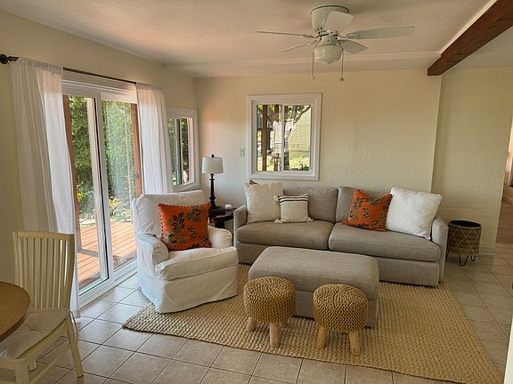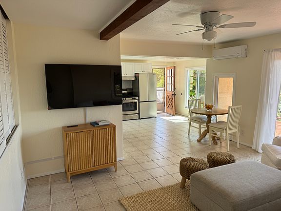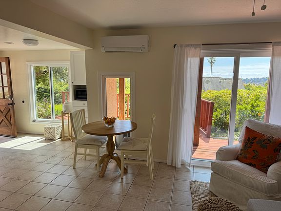 SHORT TERM RENTAL Welcome to this 700-square-foot apartment. It is a quiet, light-filled space located at the end of a cul-de-sac in the Riviera. It's a one-bedroom, one-bathroom home designed for comfort, simplicity, and that laid-back coastal feel. The open-concept living area is tiled in neutral tones and filled with natural light, thanks to large sliding glass doors that lead directly to a private outdoor deck. The space is furnished with soft, beachy touches and feels like a true retreat. The kitchen is fully updated with modern appliances and has a small dining nook where you can enjoy your morning coffee with ocean and garden views. The bedroom includes built-in shelving, a mirrored closet, and sliding glass doors open to the outside greenery. Ceiling fans, air conditioning, and an in-unit washer/dryer are the essentials for easy living. Outside, the shaded deck with a pergola is perfect for relaxing or working remotely in the fresh air. Free on-street parking is available, and the apartment is just minutes from local beaches, hiking trails, and downtown Santa Barbara. It's a peaceful spot for someone who wants a quiet base in a well-loved part of town. One, Two, or Three month lease available. Non Smoking. No Pets.
