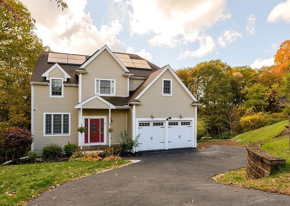Beautifully designed single family home w/ impressive 9’ ceilings on the 1st floor, grand foyer entrance, w/ an open concept kitchen w/cherry cabinetry, SS appliances , breakfast bar w/granite counter & casual dining area. Spacious family room w/ gas FP framed by built ins , formal dining room & den accented w/elegant Pillars & barn doors offering a trendy flare & flexibility w/ the layout. 2nd floor has 4 bedrooms inc the primary w/ new hdwd floors consistent with the main level as well as a 2nd fl laundry rm. Primary suite has 2 walk in closets, private bath featuring a soaking tub, tile shower and 2 vanities with granite counters. Finished LL is fully w/ a bonus/family rm , 5th bedrm, full bath & walk out the patio and outside area. Multi tiered deck over looking tree lined yard and area for above ground pool completes this home. Bonus features inc the new heat pump heating system and transferable solar lease making this home energy efficient. All on an petite cul de sac