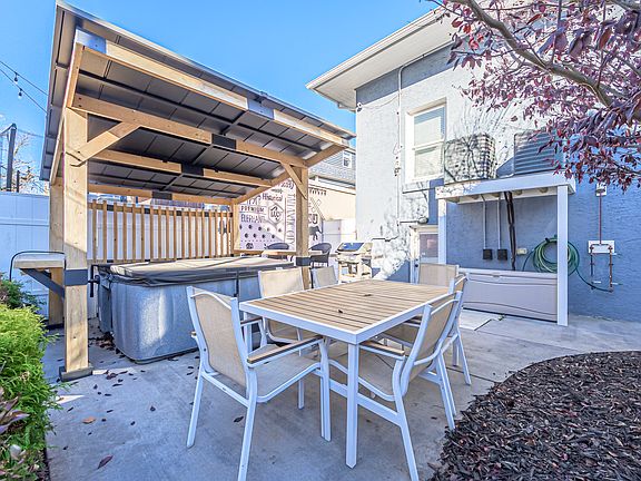 The design of the home has been carefully crafted to maintain the 1920's era architecture while infusing modern amenities. The property includes a fenced in private backyard, an outdoor shower, a six person outdoor covered hot tub, a bar with seating for two, and a dining table for six.