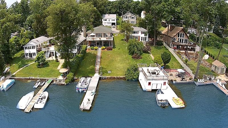 Picture perfect setting, end of street location offers level entry. 1st flr living w/finished walkout lower level & bonus suite! Easy access to lakeside dock w/sandy beach. Public water/sewer. 2960 sq ft open floor plan from LR to DR & Kitchen, lakeviews thru wall of windows! Slider to upper sun deck, 3BRS & 2 full baths w/entry from garage into foyer. Lower level offers extra high ceilings & new carpet, fam rm, wet bar, wall of windows & slider to level covered patio. Bonus suite offers BR, triple closet, full bath. EZ to add summer kitchen. This home features maintenance free siding, dura deck & rails, 50 ft dock sytem w/shore power, fireplace in LR, hdwd flooring on main level. Steel eyebeam offers possible expansion to 2nd level.