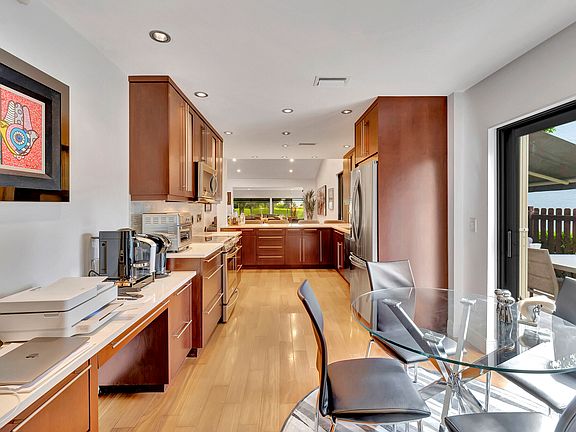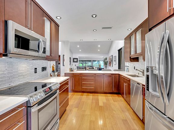 Welcome to the epitome of elegance at Hunter's Run Country Club. This meticulously renovated two-bedroom, two-bath villa boasts a sophisticated ambiance w/ engineered hardwood floors & partial impact glass + accordion shutters throughout. The heart of this home is its designer kitchen, featuring glass-front cabinets, quartzite countertops & under-cabinet lighting. Pullouts Throughout. Open-concept living & dining area is accentuated by cathedral ceilings, providing a sense of spaciousness. Primary En Suite Features Fluted Glass Doors, Soaking Tub + Oversized Glass Enclosed Shower. Enjoy the South Florida lifestyle on the patio w/ a retractable awning, creating the perfect space to unwind. One-and-a-half-car garage completes this residence, offering both luxury and practicality