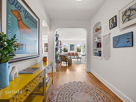 This oversized, renovated, south-facing one-bedroom co-op seamlessly blends prewar elegance with modern updates. A gracious entry foyer, with a built-in niche and elegant archways, leads to a sun-soaked living room featuring inlaid hardwood floors and lofty ceilings.