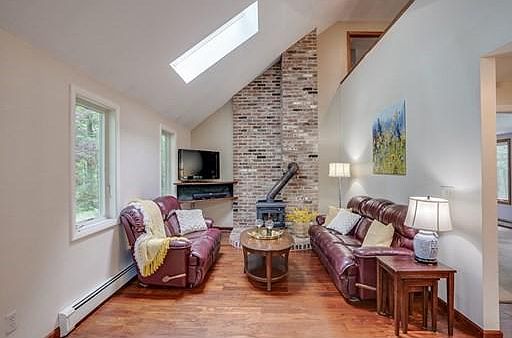 Nestled among the trees at the end of a cul de sac, 40 Tenney Road feels like a sanctuary from the world. This expanded Cape offers an ideal layout for those looking for single level living. The vaulted ceiling living room is open to the dining area & features a wood stove & skylights. The updated kitchen is gorgeous with shaker style white cabinets, granite countertops & ss appliances & opens to the sun room overlooking the private tree lined yard. The 1st floor master suite offers deck access, a walk-in closet & spa inspired bath with a soaking tub, custom tiled shower & marble floor. 3 generous sized bedrooms & a full bath can be found on the second floor. The finished lower level is an unexpected surprise with a bonus room, home gym & workshop. Updates include newer roof, boiler, cedar siding, 200 Amp electric panel. Less than 2 miles to Rte 95, minutes to shopping, the commuter rail, downtown Newburyport, Plum Island & Crane Beach. Showings begin at OH Sat 8/21 & Sun 8/22 11-1