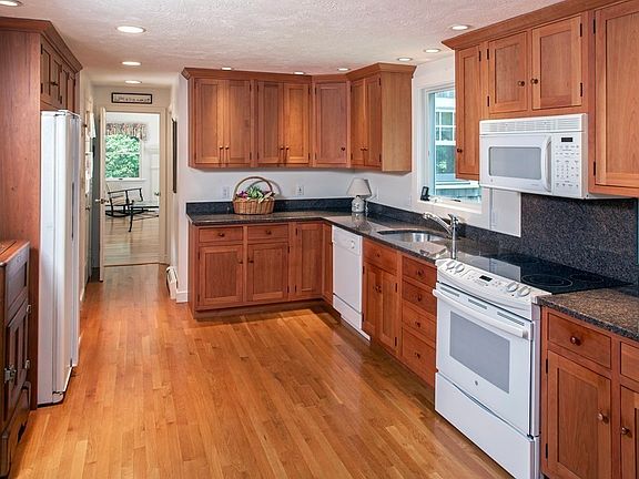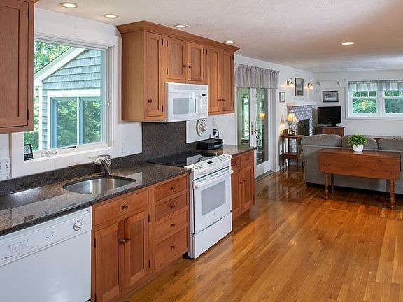This meticulously maintained Gambrel Cape enjoys a private setting at the end of a cul de sac of higher priced homes. The home offers a versatile floor plan, with all the space you need for today's busy lifestyle - even for multi-generational living. The living and dining rooms open to a central kitchen/family room, all with hardwood floors; the eat in kitchen offers Shaker cabinets, granite countertops, newer appliances and is open to the fireplaced family room area. There is a newer addition of a 1st floor family room with bay window, 2 closets and an adjacent full bath. The 2nd floor offers three bedrooms with an updated full bath; the primary bedroom has a double closets and a door to access the bath. There are two additional bedrooms, each with pine flooring & ample closet space. Another plus - a 3 season sunroom with vaulted ceiling and oversized windows which looks out on the 2.7 acre setting. Carefully maintained and updated, this is a wonderful opportunity for any family!