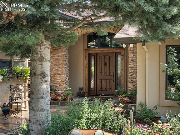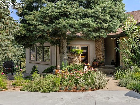 A serene hillside retreat tucked away in the trees just moments from the Broadmoor hotel. This exceptional residence in Broadmoor Heights sits on nearly half an acre, blending indoor comfort and outdoor living. Step outside to expansive outdoor living areas and private gardens all surrounded by towering pines that embrace the mountain terrain. The open, flowing main level has rich hardwood floors, floor to ceiling windows, and a walk out to an expansive deck ideal for entertaining and outdoor living. The primary suite is a true retreat complete with a stone fireplace, dual walk-in closets, and a spa like bathroom. The chef’s kitchen is outfitted with high-end appliances, custom cabinetry, two granite islands and is ideal for hosting or quiet evenings. Main level office with custom built ins and wraparound windows. Lower-level guest suites with private walk-out access and media room. Two garages with EV charger and carport plus an additional free-standing garage or workshop. This 4,189 square foot home is ideal for the buyer seeking privacy, elegance and a lifestyle anchored in an iconic Broadmoor neighborhood. Buyer has the option to join the Broadmoor Golf Club.