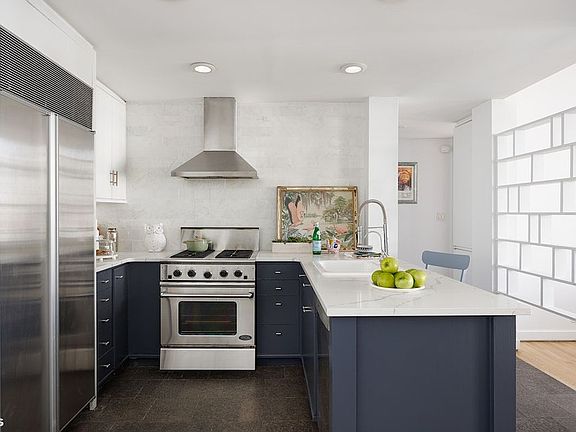 The entry reveals a dramatic, creative home filled with abundant natural light thanks to expansive windows and open city views. The open kitchen features stone flooring, a vented four-burner gas range with oven, Sub-Zero refrigerator, Bosch dishwasher, and a playful mix of white and blue cabinetry accented by a classic white-tile backsplash and a dining peninsula perfect for elaborate home cooking and entertaining.