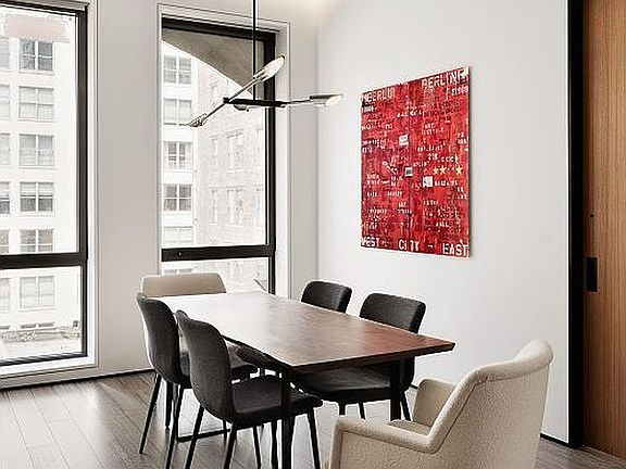 Master bedroom offers generous closet space, Empire State Building views, and a stunning en-suite Bathroom with Fantini fixtures, double sink vanity, and massive shower with Marble accent wall and rainfall shower head. Large Second bedroom with great closets. Third Bedroom is Interior, and is currently set up as an office/den. Guest bathroom features Graff fixtures, and a luxurious deep soaking tub/shower combination. Grand living area with floor-to-ceiling tilt and turn windows and dining space for eight. Frameless WAC recessed light fixtures in 10.5’ ceilings with Nest/Control4 Home Automation: set the lighting mood, music, temperature, and window shades with your smartphone or just your voice.
