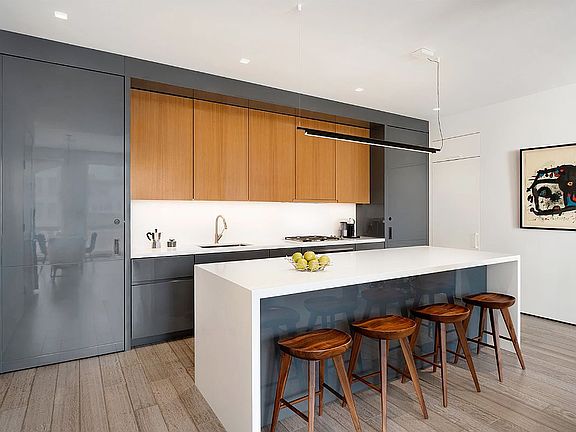 Two-bedroom with Home Office, renovation in a 1920’s loft style building designed by renowned architect SudioLAB NYC. A single large floating ceiling with perimeter cove lighting was built over the living and dining space to accentuate the extra tall ceiling height. The ceiling also serves to hide LED recessed lighting, speakers and sprinkler heads. Entire home wired for sound and powered by Sonos. Custom teak veneer doors are wrapped with blackened steel door jams and a blackened steel base reveal that match the extra-large aluminum windows. Custom blackened steel door frames with 8’ oak veneered interior doors, ducted Central Heat and A/C, Electric Solar Shades and radiant heated bathroom floors. High gloss gray lacquer cabinetry was used in the kitchen as well as for the matching living room TV unit.
