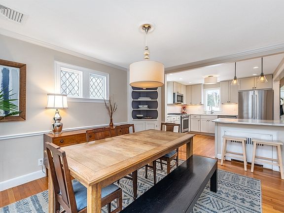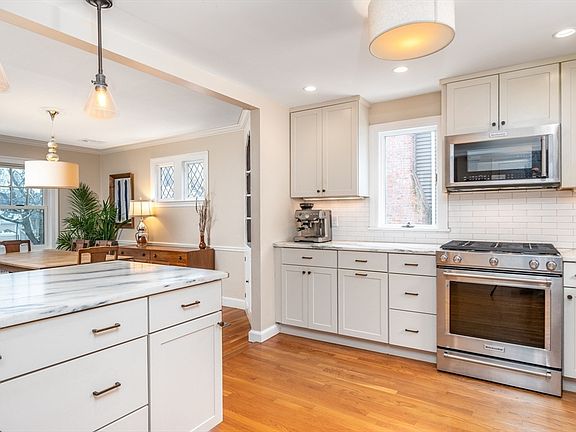 It's already been done for you! This property has undergone meticulous and thoughtful renovations throughout. The main level features an open kitchen/dining room concept, showcasing period details mixed beautifully with a modern classic kitchen: SS appliance, marble counters, contemporary lighting, and breakfast bar. Gather in front of the fireplace in the spacious living room or grab a book and cozy up in the sunroom, with a view of the landscaped yard and stunning specimen trees. Upstairs, the luxurious primary suite will spoil you... Double vanity, double shower heads, double closets, all the finest materials. 2 more bedrooms + a family bath are on this level. Bonus 3rd level! Skylights + its own cooling/heating zone make this space perfect for an office, yoga retreat or personal hideaway. Hangout and/or gym space are in the lower level with a convenient bathroom nearby. 1c direct entry garage. Close to shops/restaurants + playground in Newton Highlands! 2 min to the T!