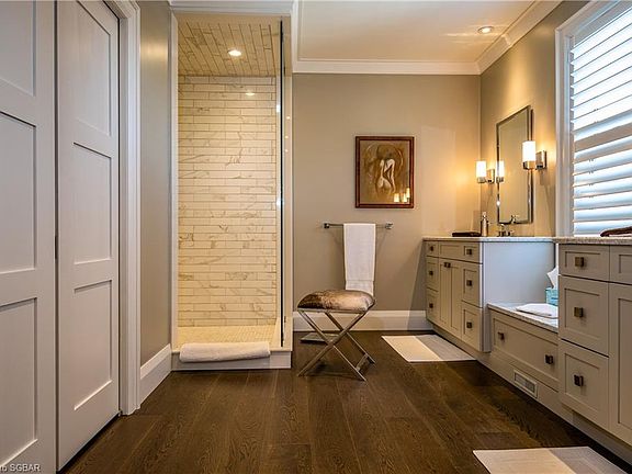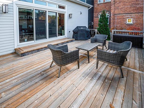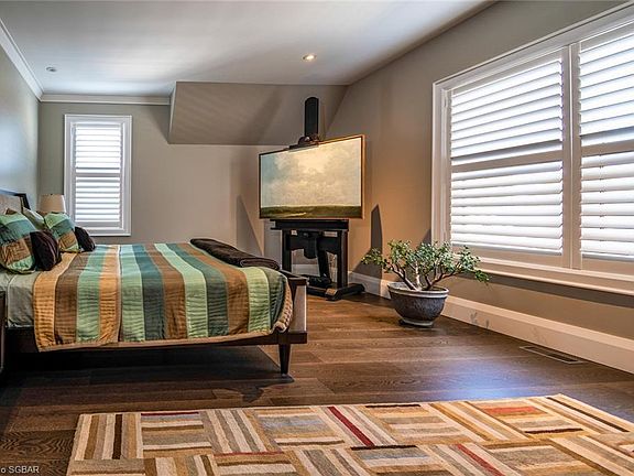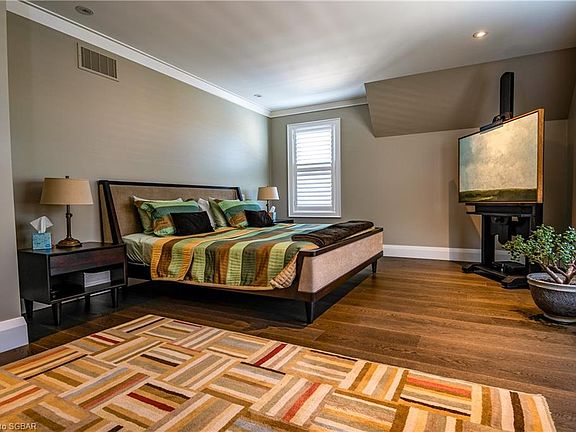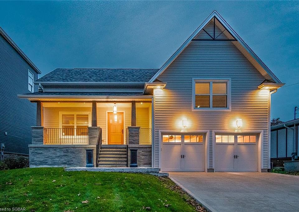 Have you been waiting for a quality listing in downtown Collingwood? Take the time to view this stunning, custom built nearly new, professionally designed and decorated, raised bungalow in C'woods up and coming, trendy east side, 3-4 bedrooms, 3 baths, modern open concept luxury living, double sliders to cedar multi level rear deck and stone patio, elegant stone and glass counters in designer kitchen featuring S/S Jennair appliances incl B/I drawer microwave and steam oven, LED's throughout, tasteful, practical engineered hardwood flooring, 10' ceilings with zoned in ceiling speakers, very unique 2 sided peninsula gas F/P between dining and living rooms,separate lofted master wing with access via stainless & glass highlighted open back riser lighting stairs with soaring glass panels, featuring generous master ensuite with private W/C, "no door" custom glass wall shower with large rainhead, double sinks, pocket door access to private dressing area, fully finished lower level offering two additional carpeted bedrooms, large windows, 5 pc washroom, area under stairs finished to offer wine storage, large laundry room with custom cabinets, whirlpool appliances, plenty of storage in HVAC room with B'I shelves, 96% efficient FAG furnace,A/C, Vanee HRV, hot water recirculation line to kitchen sink, attached oversized 19' x 30' garage with access from lower and main levels, dbl insulated garage doors with upper glass panels and remote openers, door to side/rear yard, double concrete drive,EXCEPTIONAL, NEARLY NEW (Tarion warranty in place) BEAUTIFULLY FINISHED,LOW MAINTENANCE HOME LOCATED ON AN EASILY MANAGEABLE SIZED LOT-walk or ride to Sunset Point for a swim, go kayaking or fishing by the yacht club, stroll to downtown restaurants, theatre, shopping, pubs and all that is downtown Collingwood