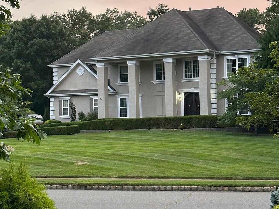 Professional landscape lighting beautifully illuminates the home's exterior, creating a warm and inviting atmosphere day and night.