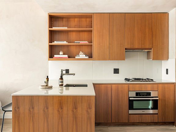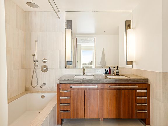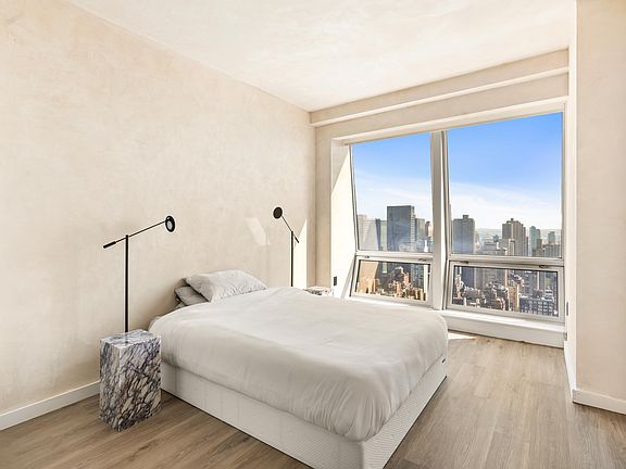 Perched on the 45th floor, this furnished residence features dramatic floor-to-ceiling windows framing sweeping views of the East River, Brooklyn, and the Manhattan skyline. The interior is thoughtfully designed with a spacious open kitchen offering abundant counter space, an in-unit washer and dryer, a large powder room, and generous closet storage. Warm hardwood floors and custom cabinetry enhance the inviting atmosphere throughout.