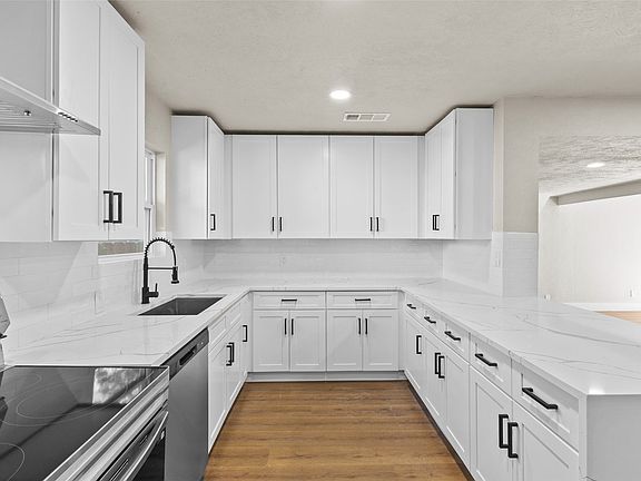 Beautifully remodeled corner-lot home featuring a charming covered front porch and mature trees that provide excellent shade and curb appeal. This spacious property offers 5 bedrooms and 3 fully remodeled bathrooms with new LVP flooring throughout. The modern white kitchen is a showstopper, showcasing a waterfall peninsula with wood accents, ample cabinet space, and includes a stove, microwave, and refrigerator. Upstairs, you’ll find a private fifth bedroom with a walk-in closet and full bath. Recent updates include a newly updated roof and foundation, providing peace of mind for years to come. Enjoy your own private courtyard perfect for relaxing or entertaining, separated from the main backyard. The home also offers extra parking space with a carport and a backyard storage shed for added convenience. Minutes from downtown Garland and shopping and dining.