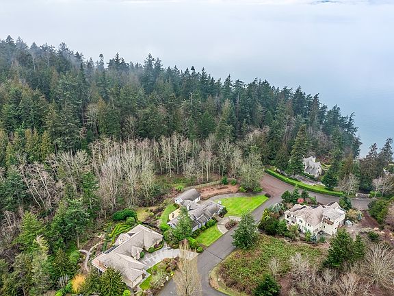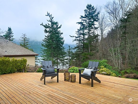 Edgemoor immaculate Chuckanut Bay view home situated on a 1/2 acre private, flat lot - a truly rare and extraordinary location. Main floor primary suite with a walk-in closet + door to deck. 2nd bedroom on main. Family room with fireplace. Den/office or media room. Dining room. Living room with double-sided fireplace. Tongue and groove vaulted ceilings. Contemporary kitchen with newer appliances with bar seating, breakfast nook, fireplace + slider to deck. Laundry room with sink. 2 bedrooms and a 3rd bath upstairs. South-facing deck. Circular driveway. Separate driveway leading to a 2-car garage. Fenced garden area. Room to add a pool, basketball, pickleball or tennis courts. Miles of fantastic walks with Clark's Point at your door step.