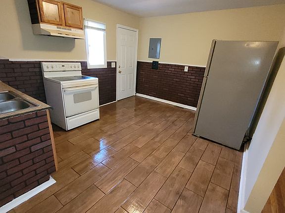 The kitchen is equipped with a refrigerator and electric stove.