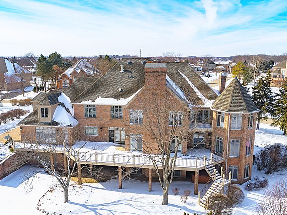 Upscale and elegant, this all brick Boulder Ridge Estate home was originally constructed as the Boulder Ridge Clubhouse and later converted in 2000 to this incredible home featuring 5 bedrooms, 5.2 bathrooms, circular paver driveway, 7 car garage spaces, 4 fireplaces, 3 level turret and over 10,000 square feet of living space plus a new roof in 2017. The 2 story Grand Foyer welcomes you in to the first floor that boasts a spacious kitchen with butler's pantry, formal living/dining rooms, family room, office and mudroom. The second floor has an exceptional master suite with a stone fireplace, luxury master bath, sitting area and dual walk in closets. 3 enormous additional bedrooms on this floor. The lower level highlights include a full kitchen, rec room, exercise room, game room, 5th bedroom, full bath, gaming area and theater room. For entertaining, enjoy the deck on the first level and a paver patio off the lower level overlooking the 9th fairway! Don't forget to view the 3D tour!