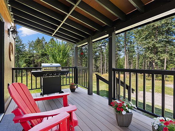 Covered side deckAbundant natural lightSerene wooded montana beautyHickory floorsHickory cabinetsCenter island