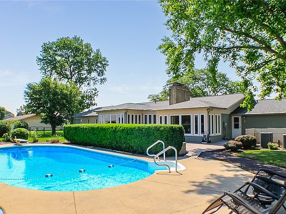 Outside, the features continue to impress. A brand-new oversized garage door opens to a 3-car capacity, ideal for car lovers or storage needs. The massive concrete driveway provides additional parking for 12, while the backyard is a true oasis—complete with an in-ground pool (with pool-house), brick planters and expansive stamped concrete patio perfect for summer entertaining.