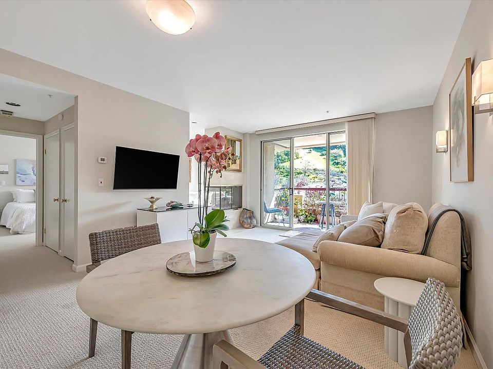 This light-filled, East-facing unit in Marin's premier gated 55+ Senior Living Community offers extraordinary luxury living. Set within the highly desirable 400 building, this one bedroom plus den, two full bath residence features a picturesque hillside outlook and abundant natural light. The open kitchen seamlessly integrates with the dining area and living room, complete with a double-sided gas fireplace and a sunny attached terrace. The spacious primary suite includes a large walk-in closet and a well-appointed bathroom. Additional amenities such as a washer/dryer, ample closets, and extra storage enhance convenience. Residents of Smith Ranch enjoy an array of amenities, including a 24-hour security call system, weekly housekeeping, 5-star dining, fitness and wellness centers, valet services, lap pool, spa, bocce ball, putting green, game room, hair salon, library, and a vibrant monthly calendar of events and activities. Plus, the community is pet-friendly, making it an ideal place to call home.