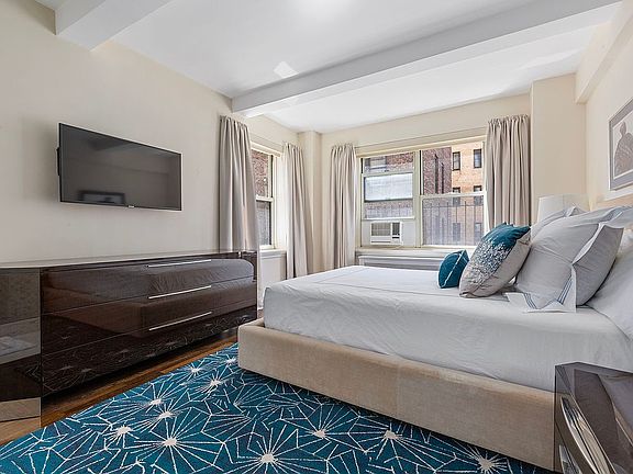 Relish the views and tranquility of boats gliding along the East River from the oversized bedroom, featuring double exposures to the east and south. The windowed bath is beautifully finished with imported tile, a glass shower with gorgeous inlay stone and custom storage. Additional highlights: Enormous pantry, hardwood floors, beamed high ceilings, trim moldings, thru-wall a/c in LR, can be put into the bedroom, electronic solar and roman shades, three closets including 2 massive outfitted walk in closets and recessed dimmer lighting throughout. Washer dryers permitted with board approval.