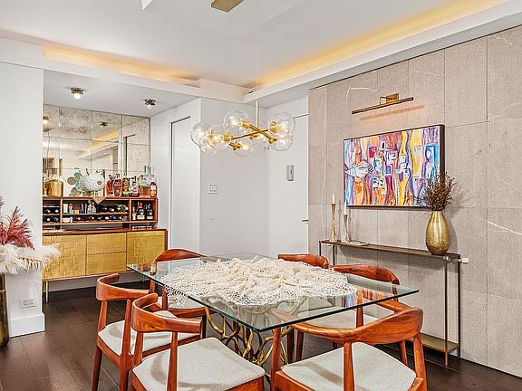 Just off the entryway of the apartment, a stylish bar greets you and flows seamlessly into the dining area before opening to a large living room — the perfect area for entertaining or relaxing. The kitchen has been completely reimagined with a full suite of updated appliances — including a refrigerator, dishwasher, stove, and microwave — along with a mini island that provides both additional prep space and casual seating.