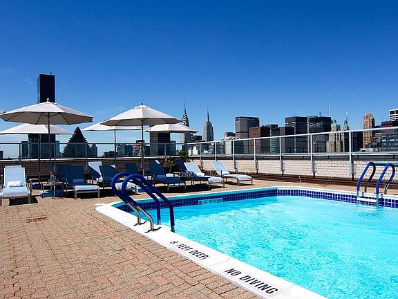 Monthly maintenance includes all utilities, adding even more value. Situated in Plaza 400, one of the area's most desirable full-service co-ops, the building allows 70% financing and an impressive lineup of amenities: a fitness center, bike room, large laundry room, and on-site garage. Best of all? Head to the rooftop to find an outdoor heated pool, a beautiful sundeck, and a residents' lounge with panoramic city views-a true urban escape. Pied-a-terres allowed. 2% flip tax.