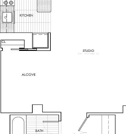 Modern alcove studio. Featuring an open kitchen with stainless steel appliances, ample closet space, and a beautiful white tiled bathroom. Picture are from a similar J line.