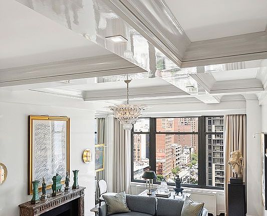 The living room is a magnificent masterpiece with Ivory high gloss lacquered walls, herringbone oak floors, oversized windows, 10.5’ coffered ceilings,19th century French Rouge marble mantel from Waldorf Astoria framing the wood burning fireplace, rock crystal sconces, vintage Murano chandelier with beautiful and ever-changing views of the bridge, the streets, the avenues and the lovely Roosevelt Island tram in the distance passing by every so often.