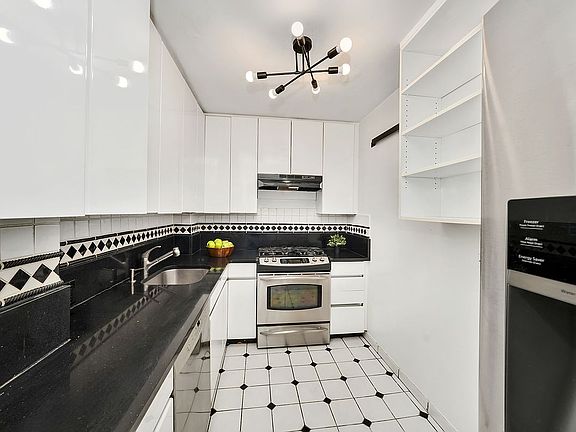 The renovated kitchen features white cabinetry, stainless-steel appliances, black granite counters, and a modern black-and-white tile backsplash.