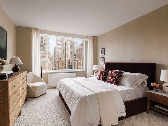 Residence 12E is a spacious corner two-bedroom, two-bath home spanning 1,174 SF with bright southwest exposure overlooking the NYC skyline, featuring 7-inch-wide European French oak floors and elegant bay windows that frame the open city views. The foyer includes two entry closets and leads to the passthrough kitchen and pantry, outfitted with Miele appliances. Custom Italian cabinetry paired with Imperial Danby marble countertops accented by polished nickel fixtures, and stainless-steel sink with garbage disposal, complete the space. The primary bedroom suite features a large walk-in closet and ensuite bathroom with a custom vanity and Volaka marble countertops, and undermounted sink, accented by polished nickel fixtures. Greek Volaka marble flooring with a Grigio Niccola border complements the elegant design. The secondary bathroom includes a custom vanity with Turkish Bianco Dolomite marble countertop, walls and flooring. Residence 10E comes with smart thermostats and vented washer and dryer.