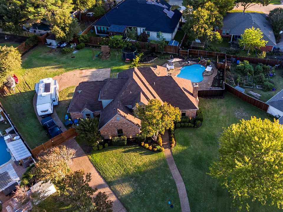 Presenting a stunning custom-built home tucked away on over half an acre in a charming cul-de-sac in Coppell, offering the unique advantage of no Homeowners Association (HOA) fees. This beautifully maintained residence masterfully merges modern conveniences with classic elegance, making it an ideal retreat for families and professionals alike. The thoughtfully designed layout encompasses four spacious bedrooms and three full bathrooms, showcasing high-end finishes and meticulous attention to detail throughout. The open floor plan effortlessly connects the living, dining, and kitchen areas, all highlighted by rich hardwood flooring and flooded with natural light, creating a warm and inviting atmosphere.