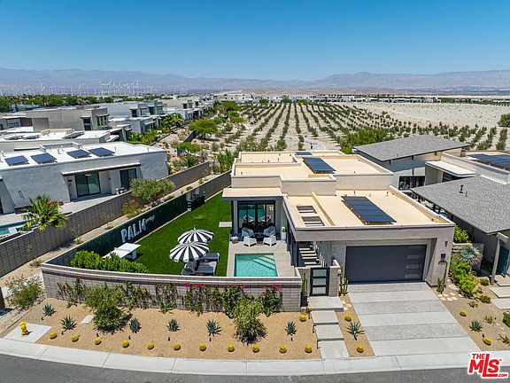A Desert Modern Masterpiece situated directly on the Olive Orchard, with unobstructed panoramic views of the San Jacinto range. Set on one of the largest lots in Miralon, with no direct neighbor to the west, the vista from your living area and pool is nothing short of jaw-dropping. Elevate your lifestyle with resort-caliber outdoor living: multiple lounge vignettes, al fresco dining around a professional-grade BBQ, manicured lawn space for yard games, and a sleek private pool designed for entertaining under the desert sky. Step into an expansive great room defined by soaring ceilings and dramatic contrasts, punctuated with luxe accents. Floor-to-ceiling windows flood the space with light and frame the mountain views. The kitchen is fully customized: top-tier appliances, minimalist hardware, and seamless flow to the dining area - perfect for staging elite events or hosting friends. Every bedroom is a private, ensuite sanctuary with designer fixtures and premium finishes. This home doesn't just accommodate - it pampers. Miralon: behind secure gates, you'll find heated community pools, a full-service fitness center, a serene yoga studio, two dog parks, and miles of walking trails, all without sacrificing your own private oasis. A short drive delivers you into the pulse of Palm Springs - its dynamic arts scene, boutique shopping, world-class dining, and entertainment. But once you return, you settle into silence, privacy, and uncompromising design. Where recent high-end builds in Palm Springs aim for drama, this home commands it with precision: oversized lot, full mountain exposure, resort-caliber finishes, and Miralon's elite amenity package. Clean, move-in ready and flexible. Furnishings are optional, available outside of escrow. You choose how this home becomes yours.