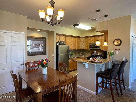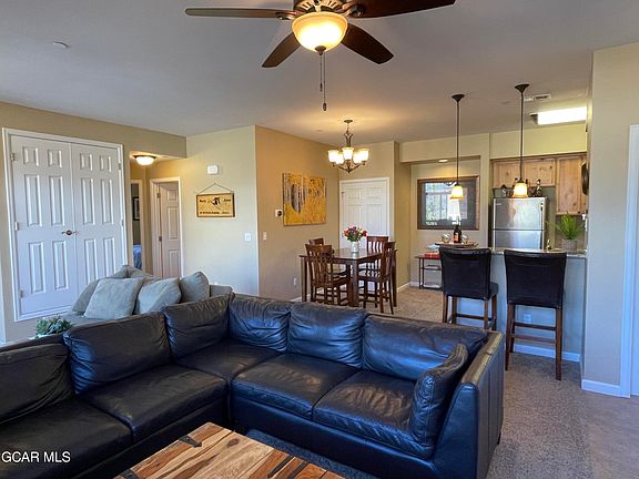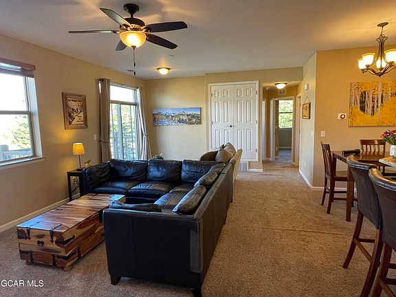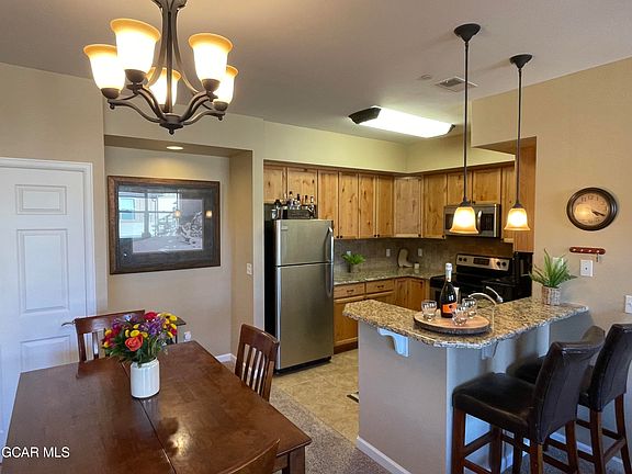More photos coming soon! Enjoy breathtaking Continental Divide views throughout! This stunning 2-bedroom condo, complete with a sweet deck and private garage, features an open floor plan. The bright kitchen shines with stainless steel appliances, granite countertops, knotty alder cabinets, and elegant slate flooring. The living area offers a cozy seating space around a gas fireplace with a slate surround and wood mantel. Open the sliding door to stargaze from the spacious deck. The primary bedroom accommodates a king bed and boasts an ensuite bathroom, while the second bedroom features a full bed w/twin pull-out underneath. In-unit washer/dryer! This top-level, one-story unit has no neighbors above or below for ultimate privacy. The oversized garage includes two private storage closets.