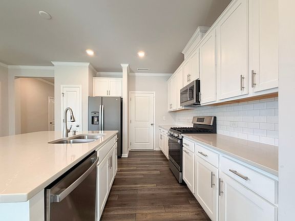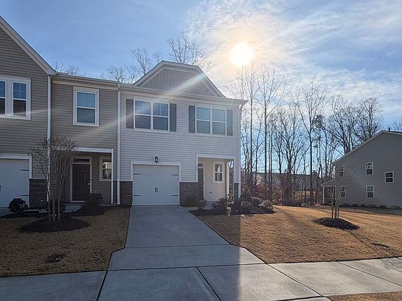 Ready for your next move? 400 Hazy Hills Lane delivers the lifestyle and location you've been looking for. End-unit townhome in the Ridgemoor community offers the perfect balance of style, function, and location. Step into a bright, open-concept layout filled with natural light, anchored by a modern kitchen featuring a quartz island, gas range, stainless steel appliances, and crisp white cabinetry. The oversized island provides plenty of prep space and bar seating for entertaining or daily living. Luxury vinyl plank flooring runs throughout the main level, connecting the kitchen to a spacious living area that opens to a screened porch with peaceful wooded views. Upstairs, enjoy three well-proportioned bedrooms and two full baths, including a primary suite with dual vanity and a tiled walk-in shower. A dedicated laundry area with washer and dryer is also included. The finished one-car garage has an epoxy floor for a clean, polished look and extra storage. West-facing orientation brings gorgeous afternoon light into the home. Neighborhood amenities include a community pool and playground, and the home is less than 10 minutes from White Oak Crossing, offering shopping, dining, Target, Starbucks, and entertainment options. Quick access to I-40 makes commuting to downtown Raleigh or RTP a breeze. Rental requirements include a minimum credit score of 625, verifiable income of at least 2.5x the monthly rent, pass background check, and no prior evictions. The first month's rent, security deposit and processing fee is due at lease signing.The property does not participate in the voucher program.