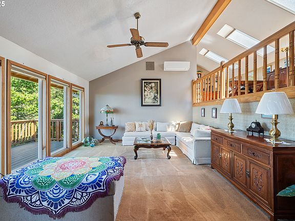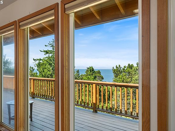 STR LICENSE TRANSFERRABLE - HILLTOP OCEANVIEW panorama filtered by beautiful evergreen trees. High above the rooftops and far from tsunami hazard, this vintage 1981 classic features large, well placed windows and wrap-around decking designed to capture all facets of each beautiful coastal day from sunrise to sunset. Living room with vaulted ceiling includes a light bright loft with 3 skylights. Open kitchen with built-ins. Entry level bedroom. Huge family room down with bar and vintage woodburning cookstove. Abundant storage. Be sure to check out the huge area under the house for your future wine cellar.