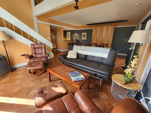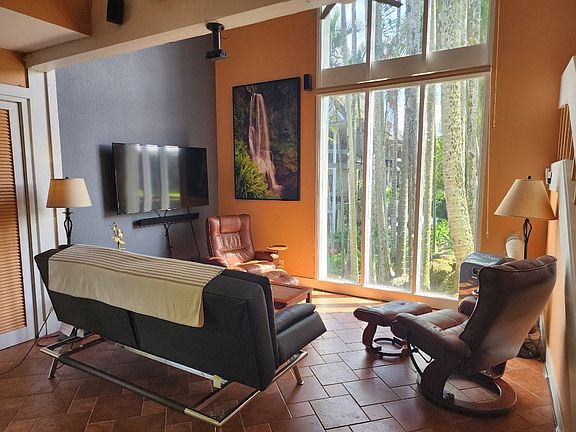 The Lehua Honeymoon Suite, an elegant and unique condominium in the Waiakea Villas. Originally built to house vacationing honeymooners, this two story, cathedral ceiling suite overlooks Waiakea Spring and Waterfalls. Upstairs is the main bedroom, bathroom, and traditional Japanese furo tub. Downstairs is a spacious living room, dining area, kitchen, powder room, wine closet, additional sleeping/study area with double murphy bed. Each level has a spacious, tiled lanai overlooking koi ponds below. This condo is over 900 sf, considerably larger than all the other condos in Waiakea Villas. Only 2 split level units in the complex & great price per square foot.