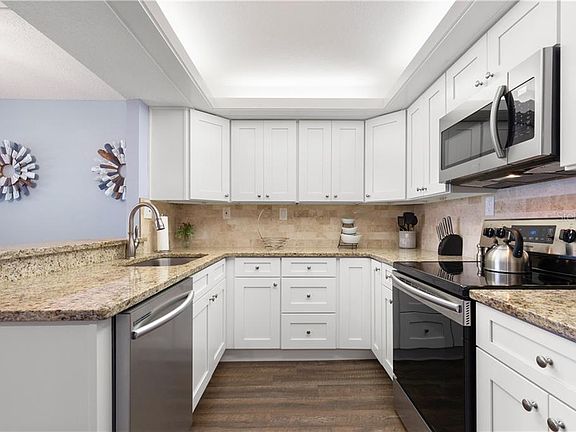 Enjoy living the Florida dream in your updated move in ready condo with lots of designer touches to welcome you home and enjoy. The New kitchen, is bright and light courtesy of the custom ceiling light fixture, features plenty of storage with light cabinetry, a wine rack, stainless steel appliances, large stainless steel sink, granite counter tops, designer back splash, desk area and breakfast bar. The kitchen opens into the dining room and large family room with floor to ceiling sliding glass doors out to the patio. Enjoy morning sunrises from the large patio with beautiful views of Island Estates and the intracoastal waterways. Down the hallway is a large guest bedroom with ceiling fan, good size closet and attractive views from the window. Across from the bedroom is a guest bathroom with a shower and washer and dryer. The large owners retreat is at the end of the hall and has plenty of room for a king size bed, night stands and more including sitting area and double closets. The en suite has a shower and tub combination and a large vanity. The home features many more updates including light fixtures, 5.25 base boards, and vinyl plank flooring. The unit comes with a prime covered parking space near the main entrance door, and a storage locker. The building has a gorgeous outdoor living space including a pool, hot tub, tiki huts, BBQ, patio deck with lounge chairs. Inside you will find a fitness center, rest rooms, and community room with kitchen. The building has recently completed a major update project including the new beautiful hallways and complete exterior painting. It is located a few steps away from the new Publix grocery store, a short bicycle ride or walk to the beach or enjoy a ride aboard the Jolly Trolly, it is close to restaurants, and other convenient amenities.