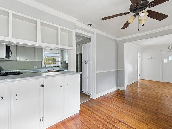 Cute, corner-lot cottage in Menlo Park, a canopied neighborhood adjacent to Myers Park/Golf Terrace // 4Bd/2Ba including an en suite primary with walk-in closet (NOTE: 4th bedroom has built-in wall shelves, but no built in closet) // Well thought renovations over the years preserved the vintage charm, but kept elements like the hardwood floors and other touches intact // Roomy kitchen has stainless farmhouse sink and pass-through window to separate dining room // Decorative ceilings can be found throughout the house // Backyard is fully privacy-fenced and has a storage shed + lounging deck