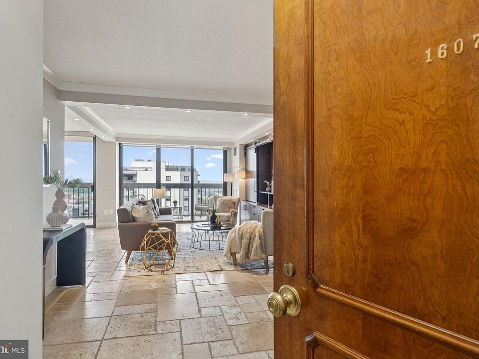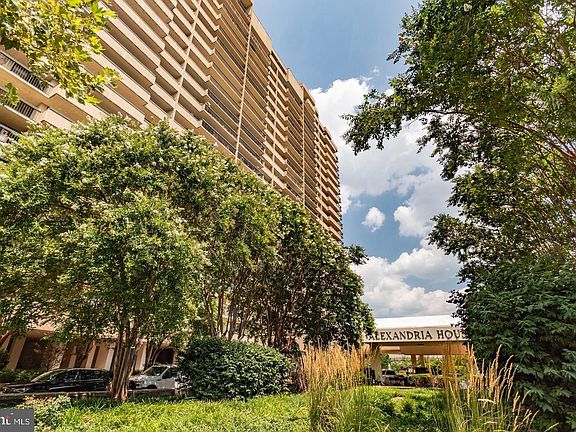 Fabulous 2 bed, 2 bath Alexandria House condo with north facing 16th floor views of the Potomac River and Washington, DC. Floor to ceiling windows with balcony access from every room. Remodeled kitchen with custom cabinetry, stainless appliances, granite countertops, backsplash, and bar top seating. Living space has tile flooring, recessed lighting, crown molding, and a custom built-in with sliding doors and work space. Both full bathrooms have been renovated with fresh tile, walk-in showers, and glass doors. Primary ensuite has two walk-in closets and sconces for extra bedside lighting. Unit comes with one assigned, garage parking spot and a storage unit. Alexandria House boasts incredible amenities to include: 24/7 front desk concierge, rooftop pool with sweeping views, gym, sauna, library, party room with kitchen, EV charging stations, community park, Amazon package delivery room, printing room, and the most helpful staff! Conveniently located near Harris Teeter, Trader Joes, coffee and restaurants, and trails. Easy access to DC, King St, metro stops, and DCA airport.