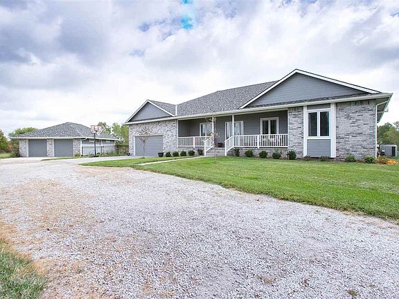 Country living SO CLOSE to the city- Located just west of town in the Goddard School District, yet minutes away from New Market Square! Home is situated on almost five acres on a corner/ cul de sac lot with a private stocked pond and about 50 fruit trees surround the property (apples, peaches, plums, and pears). East facing backyard with an oversized and partially covered wood deck, covered patio, fenced in area for the dogs, and a huge oversized detached garage with heat and air. The inside of this home has been updated with LVP flooring throughout. Open floorplan includes a formal dining room, large living room with great country views, kitchen/ dining room with eating bar, main floor laundry with large pantry and wash sink. Master suite with separate jetted tub/ shower, large walk in closet, and two sinks. Split bedroom floorplan with a 2nd bedroom and half bathroom adjacent to the master suite. The 3rd bedroom is oversized with a private bathroom and oversized closet. Huge basement with nine foot ceilings, wet bar, large family room perfect for a theatre room, as well as a large area for entertaining and game room space. 4th bedroom is oversized with another large walk in closet. Additional access to the garage from the basement. True walk out basement with large covered patio. Large storage room. Irrigation well and sprinkler system on part of the land. Show & Sell today, this home will not last long!